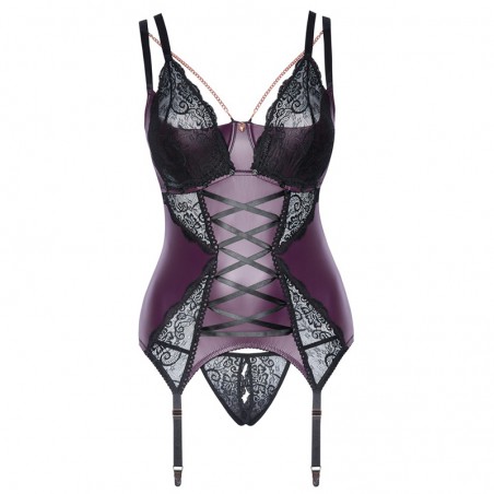 Lace fuchsia mini dress, black satin ribbon on the front and lace thong on the set. With elastic straps. 90% polyamide, 10% elastane.