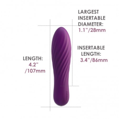 Made of soft and pleasant silicone, with a compact, discreet and very light design, specially designed to be used anywhere and transported comfortably. Slightly wider at the tip and with a textured surface of fine spiral lines. It has a powerful silent motor, with 10 vibration modes. It is rechargeable with USB cable (included), waterproof and very easy to clean. It has an approximate charging time of 60 min and its use time is 60 min.