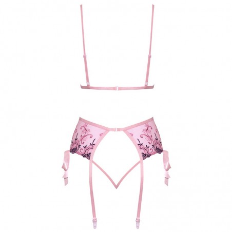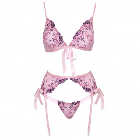 Suave conjunto de sujetador, liguero y tanga de Kissable fabricado íntegramente en fino powernet rosado con intrincados bordados florales tono sobre tono. Suave y elástico en todo su contorno para un máximo confort. Sujetador suave con un juguetón lazo en la parte delantera, el tanga tiene un lazo de satén en cada lateral. Sujetador con cierre de pinza en la espalda, los tirantes son ajustables a la medida. Liguero con cierre de gancho en la espalda y tirantes ajustables. El pequeño tanga seduce con sus dos estrechos tirantes elásticos que se unen en la entrepierna.