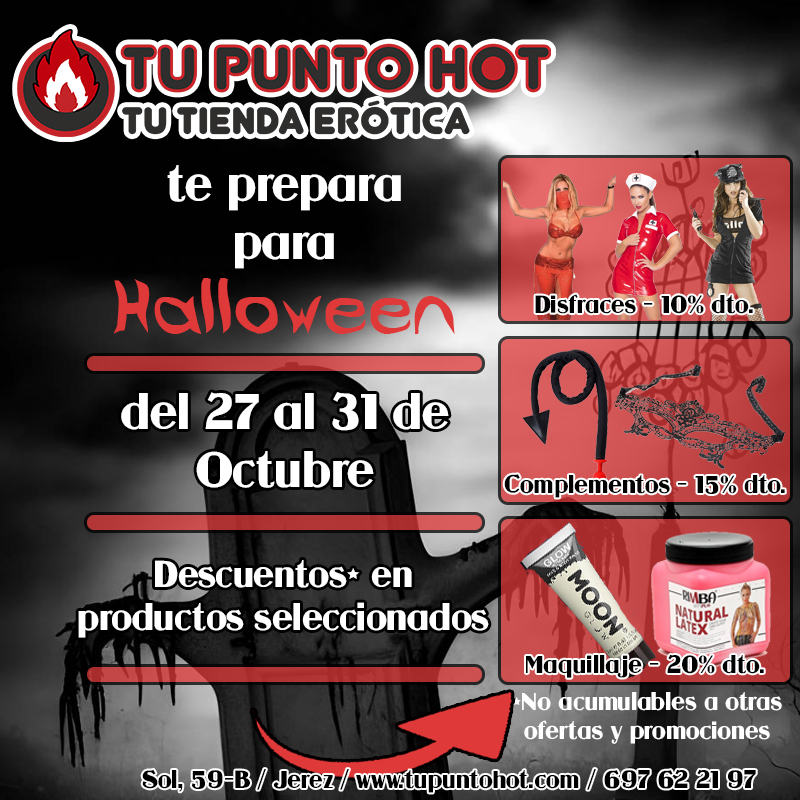 Qué miedo! Qué placer! En Halloween disfrutaré!! Y para ello tenemos una promoción en Tu Punto Hot, descuentos en disfraces, complementos y maquillaje hasta el viernes 31 a las 23:59, antes de que lleguen las brujas.