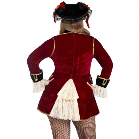 Este atrevido disfraz de pirata para mujer cuenta con un vestido de abrigo de terciopelo con un corpiño campesino anudado y detalles de volantes de encaje. Completa tu look de capa y espada con un sombrero pirata.