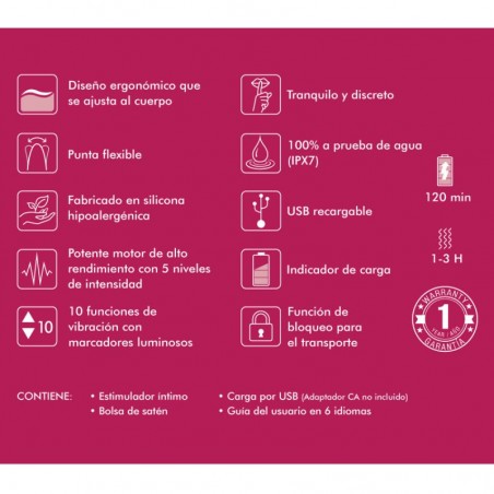 Su diseño lujoso y ergonómico, combinado con su potencia, satisfará todos tus deseos. ¡Emociones garantizadas con toda elegancia! La finura de sus vibraciones te proporcionará un abanico de sensaciones estimulantes, que te llevarán a la cima del placer vaginal o clitoriano.