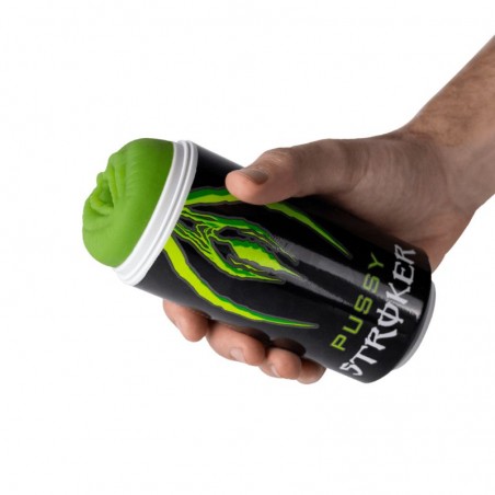 Masturbador masculino friki en bote de bebida energética y vagina monstruosa verde.