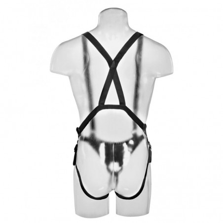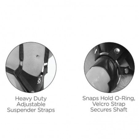 Este sistema de correas único en su tipo cuenta con dos correas de nailon resistentes para los hombros que se ajustan fácilmente para soportar el peso del enorme consolador hueco, junto con una correa de nailon ajustable para la cintura que se adapta a la mayoría de los tamaños. Una junta tórica de metal duradera mantiene el pene en su lugar cuando la acción se calienta, mientras que las correas de nailon para los muslos se ajustan fácilmente para mantener todo junto. Una correa de velcro envuelve el eje del consolador para brindar soporte adicional, y cuatro correas ayudan a asegurar la junta tórica de metal alrededor de la base del consolador.