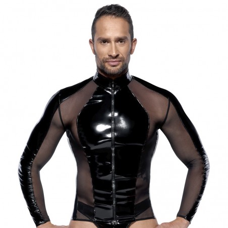 La extravagante camisa negra de manga larga de Black Level está hecha de vinilo brillante con interesantes inserciones de red transparente. Disponible de la S a la XXL.