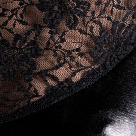 Un vestido negro brillante de efecto mojado con detalles de encaje. Tiene una silueta sensual, y el encaje negro floral en el escote y la espalda le da un toque sensual.