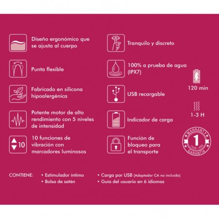 Es un juguete recargable con cable USB (incluido) y la entrada para conectarlo al juguete es impermeable. Se trata de un juguete totalmente sumergible, fácil de limpiar y necesita 120 min para su carga completa y el tiempo de uso es de entre 1-3 horas. Se recomienda el uso de lubricante a base de agua para mejorar la experiencia con el juguete.